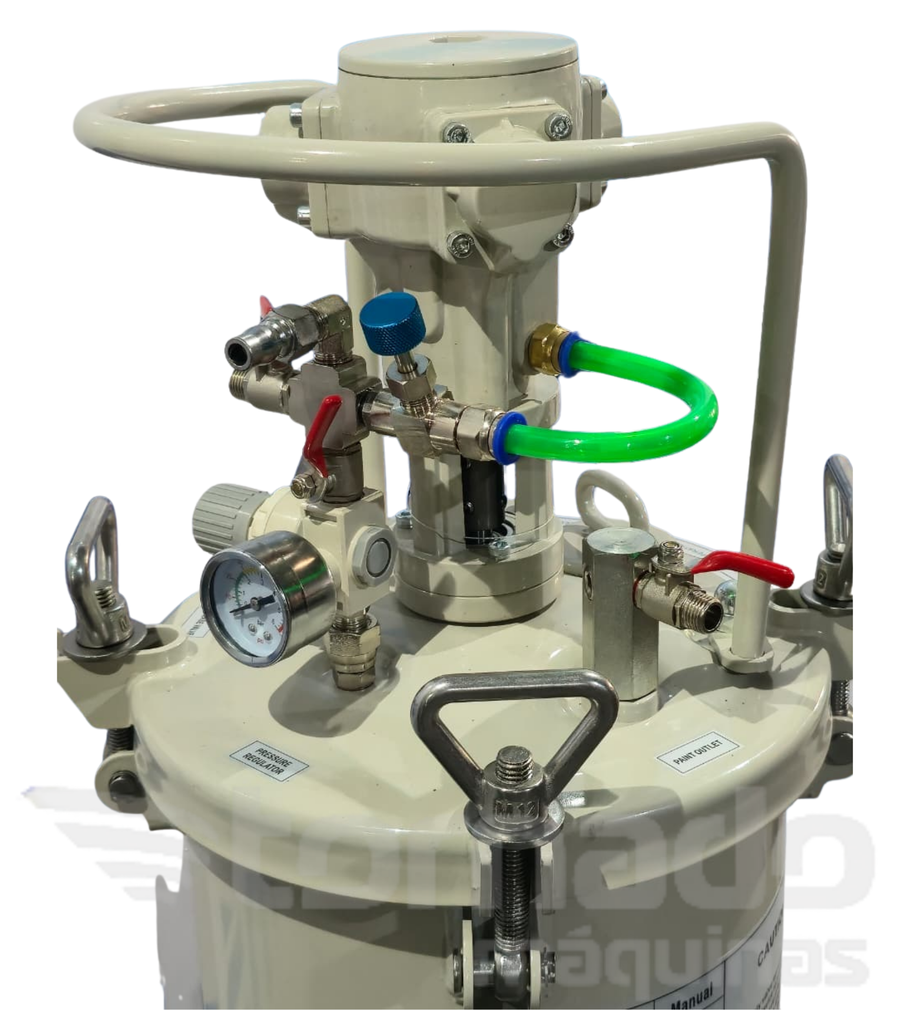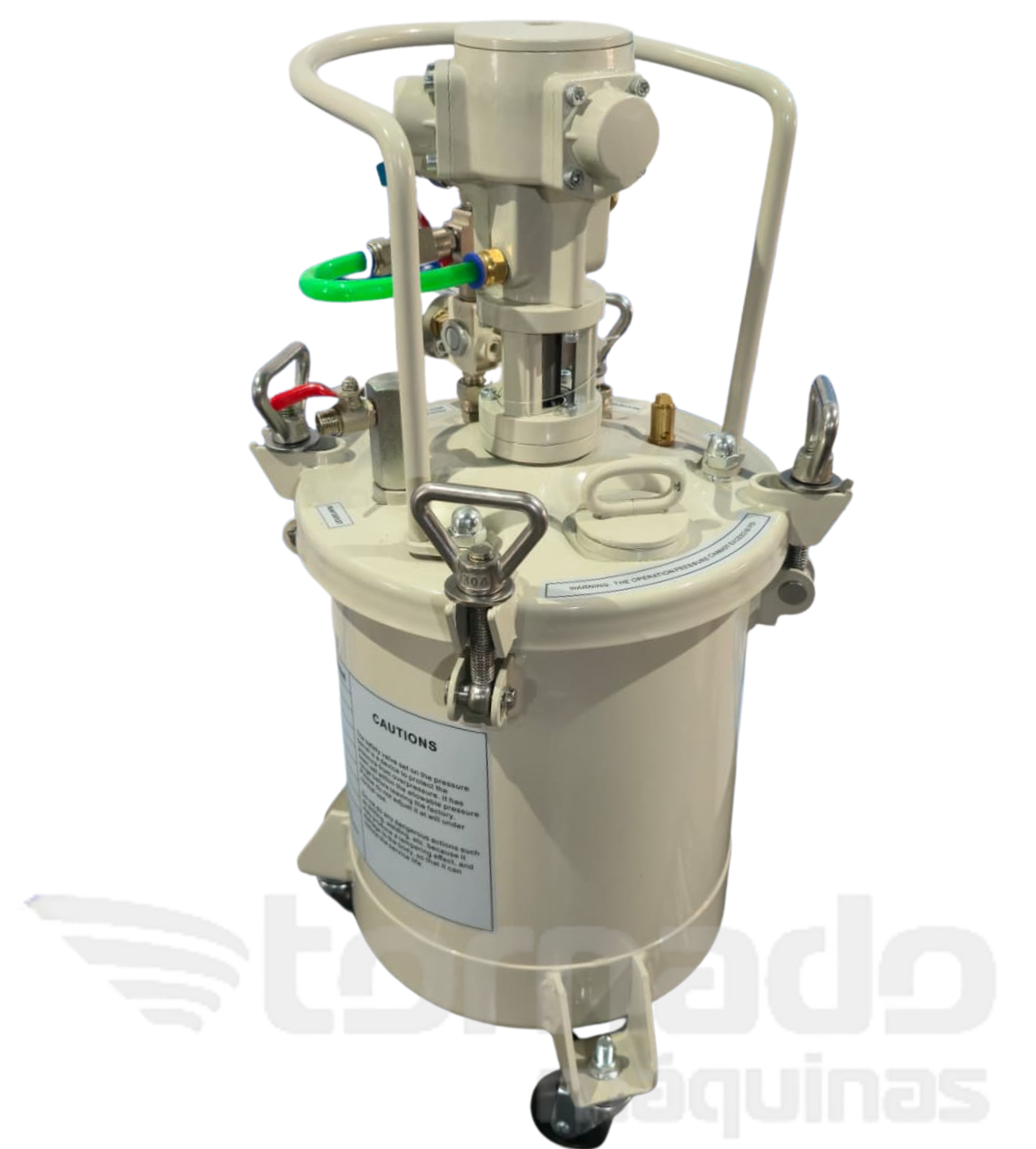 O tanque de pressão para pintura Tornado possui um agitador em sua parte superior. Com 4 sistemas de parafusos semelhantes a travas de segurança em sua tampa superior, esse modelo de tanque de pressão para pintura é bastante seguro e prático. Capacidade do tanque de pressão de pintura: 10 litros.